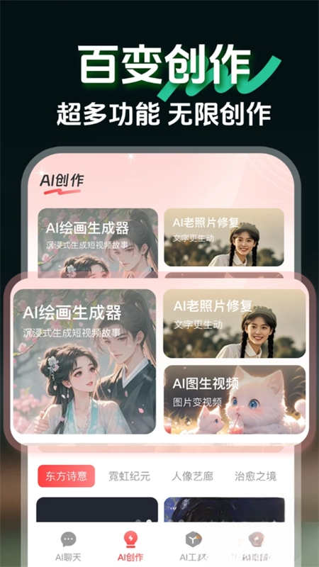 1、下载安装app后,打开进入主界面,界面清晰分为AI聊天、AI创作、AI工具等板块,根据需求点击对应功能即可开始使用。