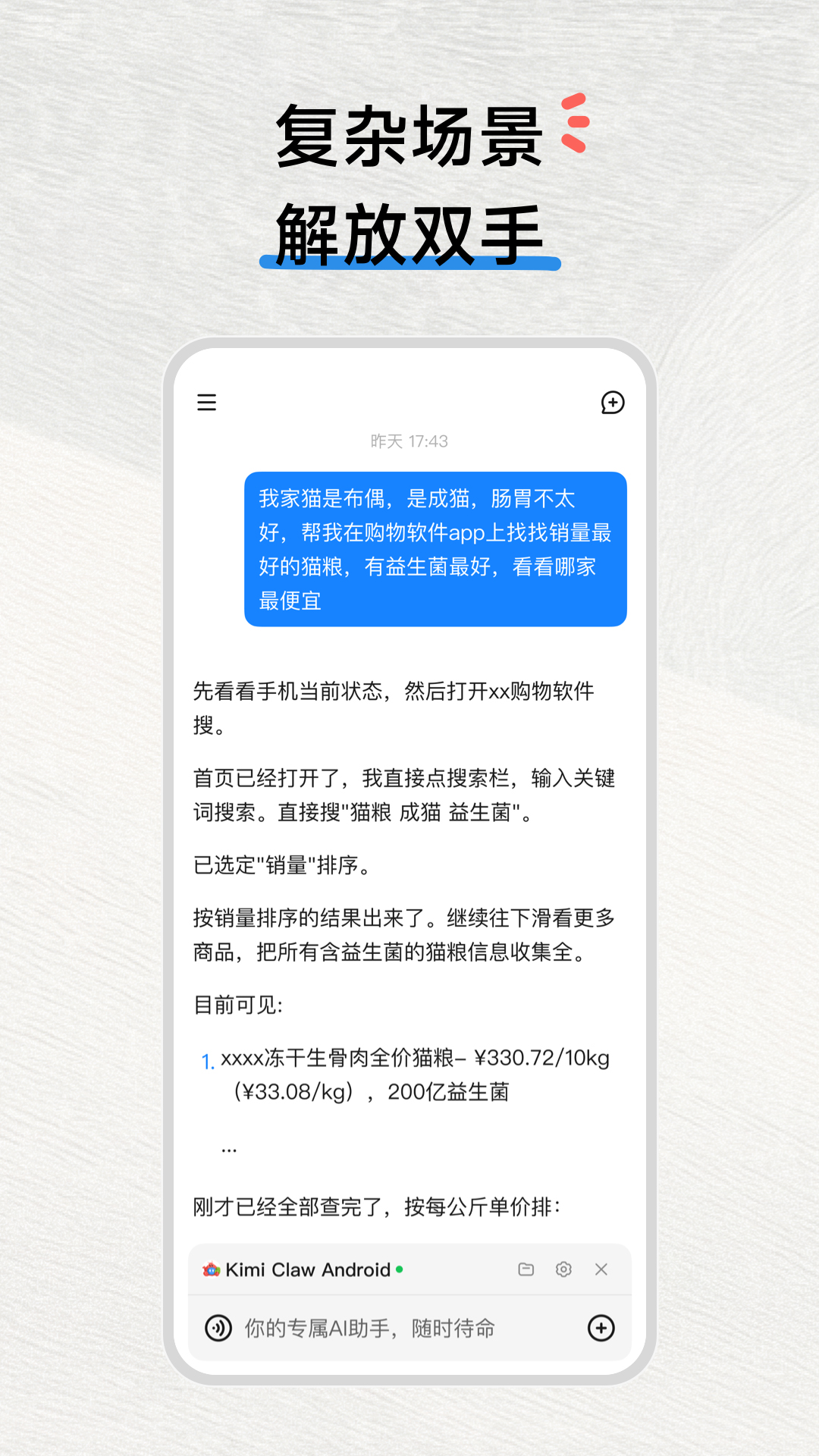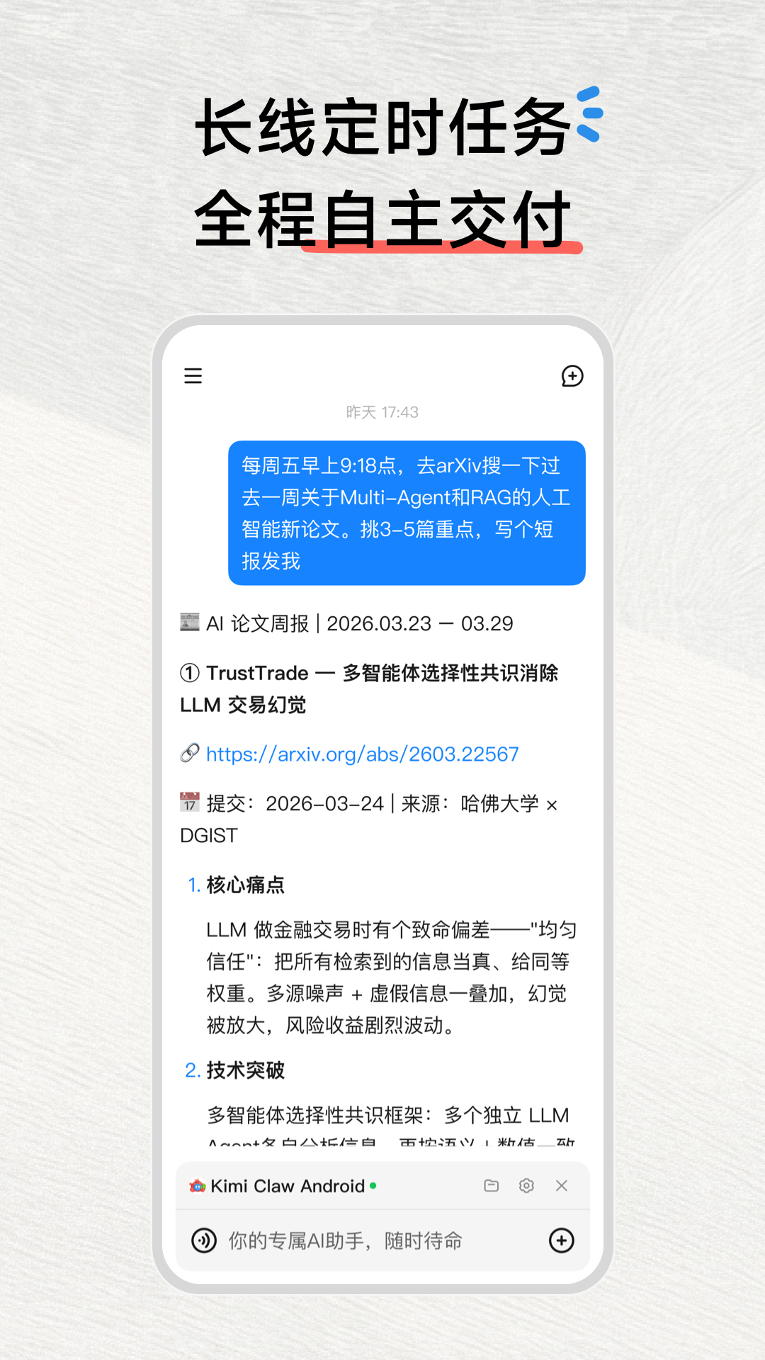 Kimi Claw也就是Kimi推出的“龙虾”工具,在AI自动化工具陆续推陈出新的今天,它也带来了0门槛的部署条件,降低用户的使用难度,在软件功能层面能在不同应用之间连贯完成任务,简单完成权限设置后就能直接使用,操作门槛不高,日常多类自动化需求都能满足,不用复杂设置就能让手机持续帮忙处理事务。