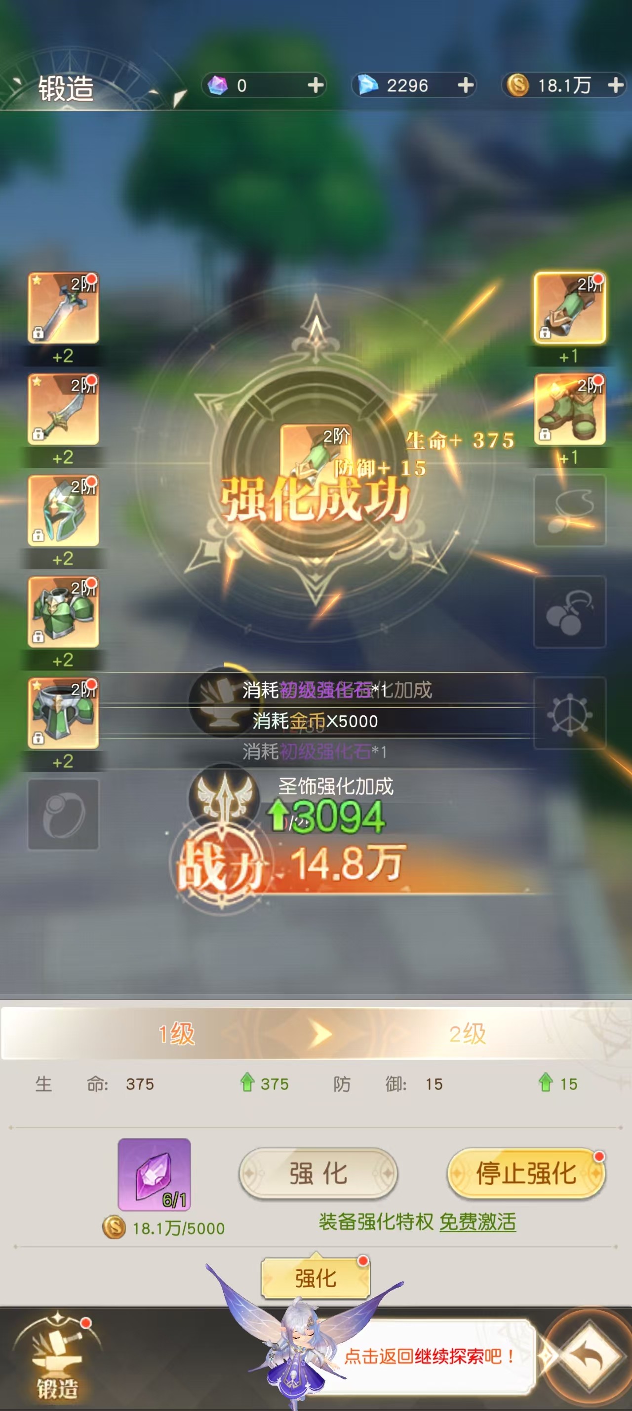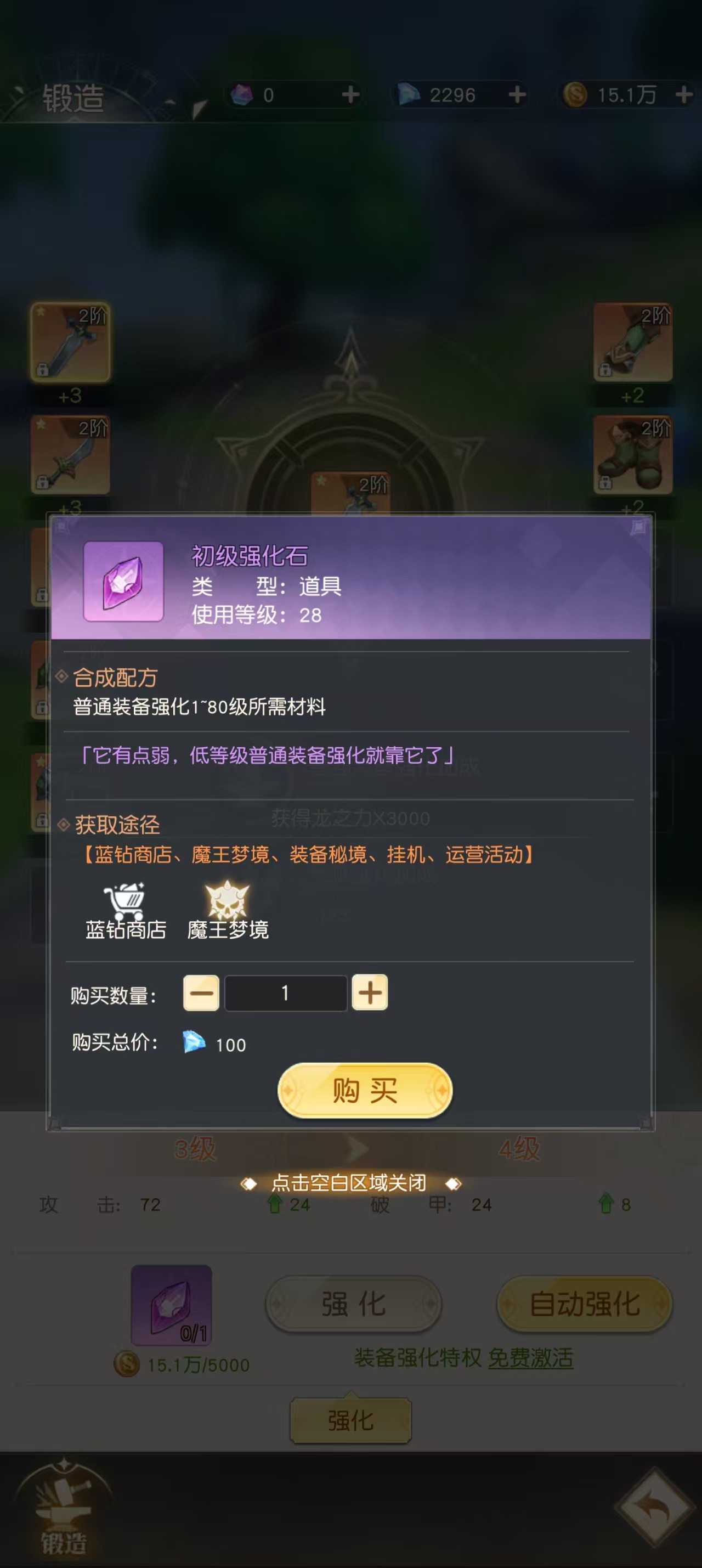但是强化之路并不是一帆风顺的,成功率和资源管理是玩家必须要面对的两座大山。虽然游戏机制允许等级达到一定要求之后再强化,但是高阶阶级的获得常常伴随着失败的风险,失败之后强化石就会消失,甚至会造成装备耐久度降低或者阶级回退。这就需要玩家在动手之前做好充足的物资储备,通过日常副本、公会商店或者限时活动大量囤积强化石。