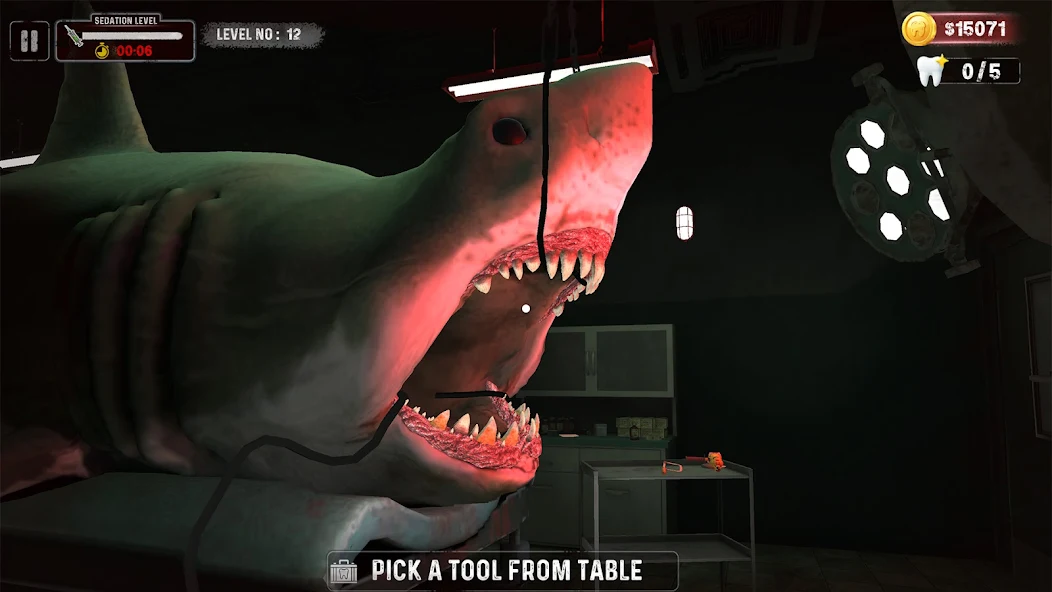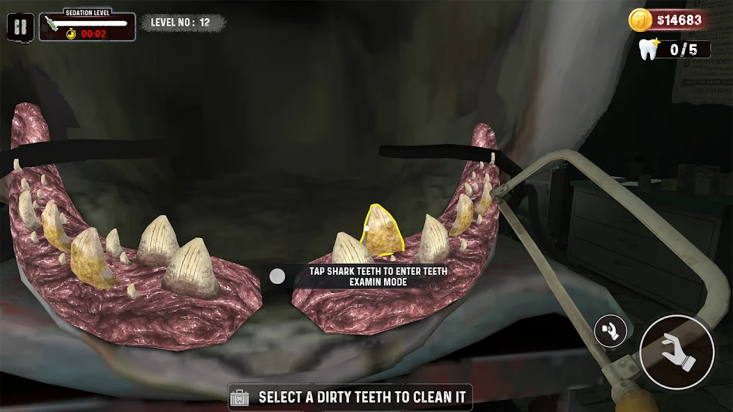 鲨鱼牙医模拟器有着很不错的逼真模拟效果,你要对着一条已经麻醉的鲨鱼处理口腔问题,手里的各类工具都要小心使用。操作时稍有不慎,就可能让鲨鱼出现过激反应,整个过程都得保持专注。每次遇到的牙齿状况都不一样,搭配不同工具处理,每次玩都会有不一样的状况出现。