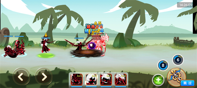 4、游戏采用横版视角,玩家可以通过虚拟摇杆来操控火柴人进行战斗,点击下方头像可以随时切换不同的火柴人角色,体验不同战斗风格。