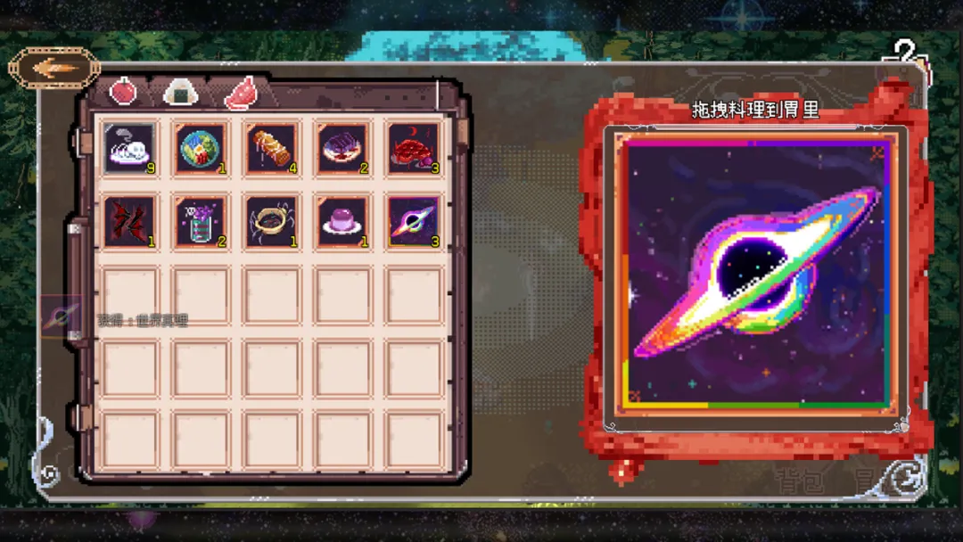 1.胃部背包共二十五格,优先选择占用格子少、增益稳定的料理,避免单一高占用料理。