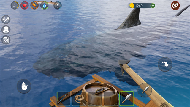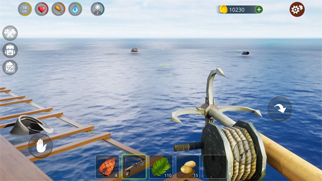 3、瞄准海面漂浮物发射锚枪,将木板、塑料瓶等物资拉回木筏。这些资源是缓解饥渴、维系生存的唯一希望。